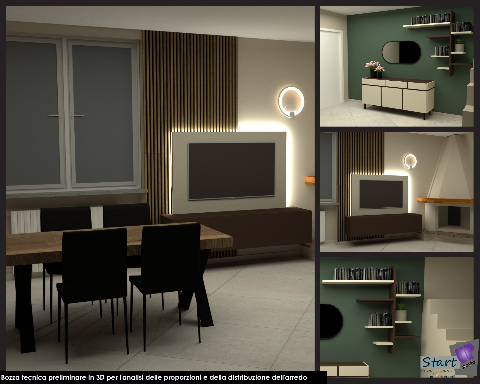 In questa realizzazione, che vi raccontiamo attraverso gli scatti dell’ambiente finito e il collage dei nostri render esplorativi, abbiamo curato il restyling completo di una zona giorno. Il nostro obiettivo? Unire linee moderne, funzionalità e un’atmosfera profondamente accogliente.