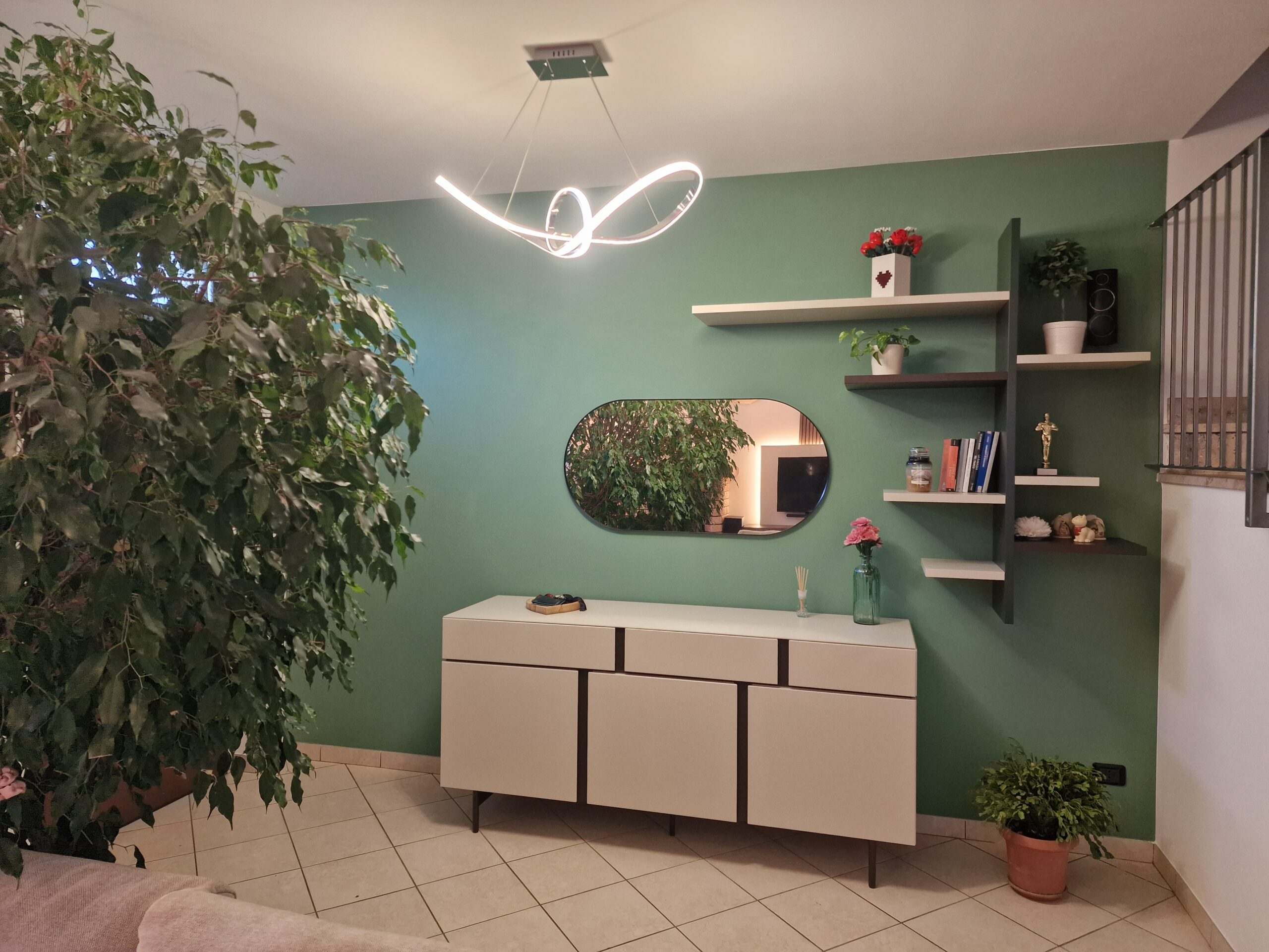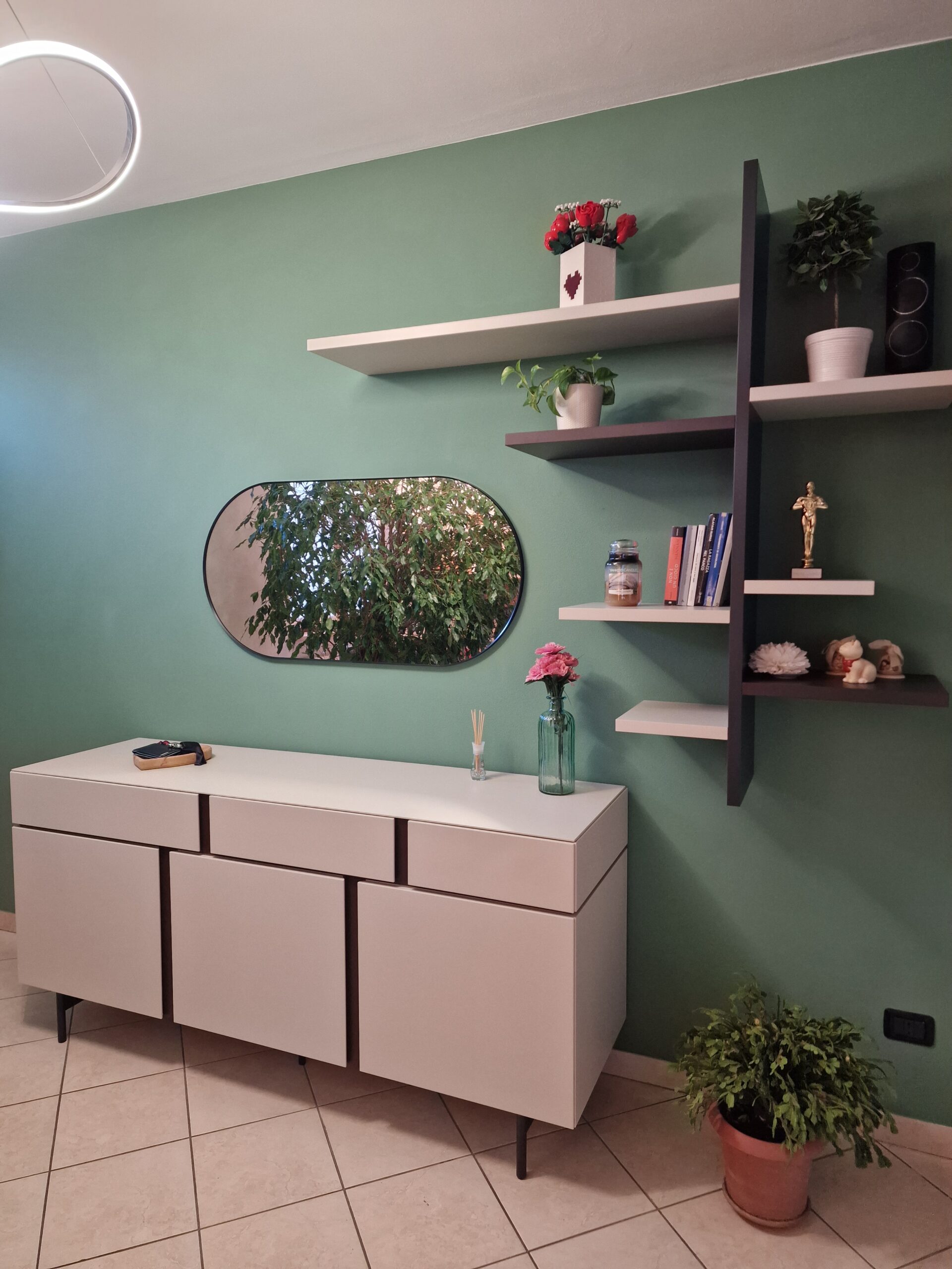 L’Ingresso: Un’Accoglienza di Carattere L’ingresso rappresenta il vero biglietto da visita della casa. Per questa zona, esaltata da una suggestiva parete verde che infonde freschezza e naturalezza, abbiamo selezionato la Madia Abaco di San Giacomo. Le sue finiture in laccato opaco, nei raffinati e caldi toni Canapa e Caffè, creano un elegante contrasto cromatico mantenendo un rigore geometrico impeccabile. Ad accompagnare la madia, troviamo una dinamica composizione di mensole: un gioco di asimmetrie e intersezioni che offre un volume espositivo perfetto, in costante dialogo visivo con la natura indoor e lo specchio ovale.