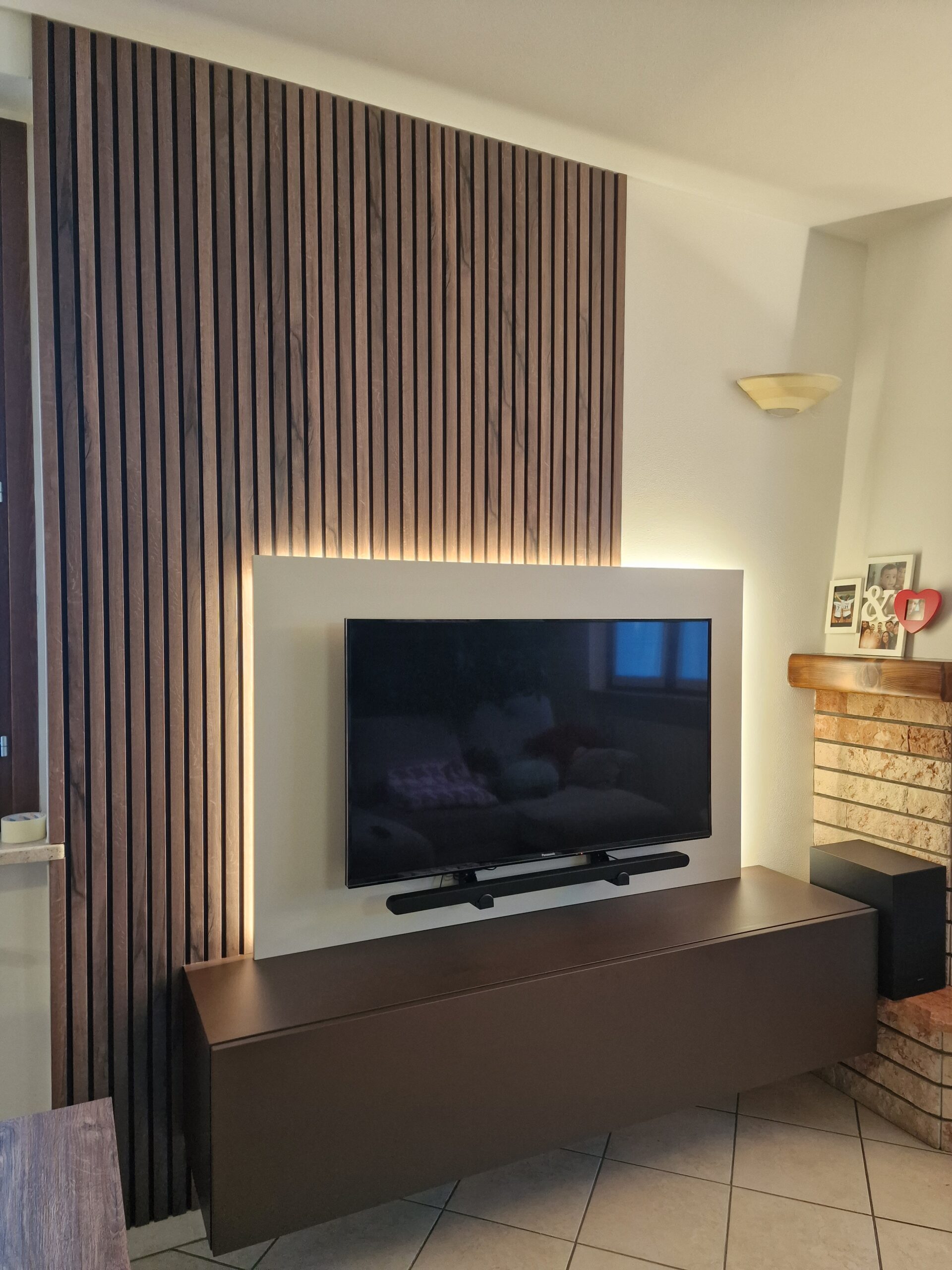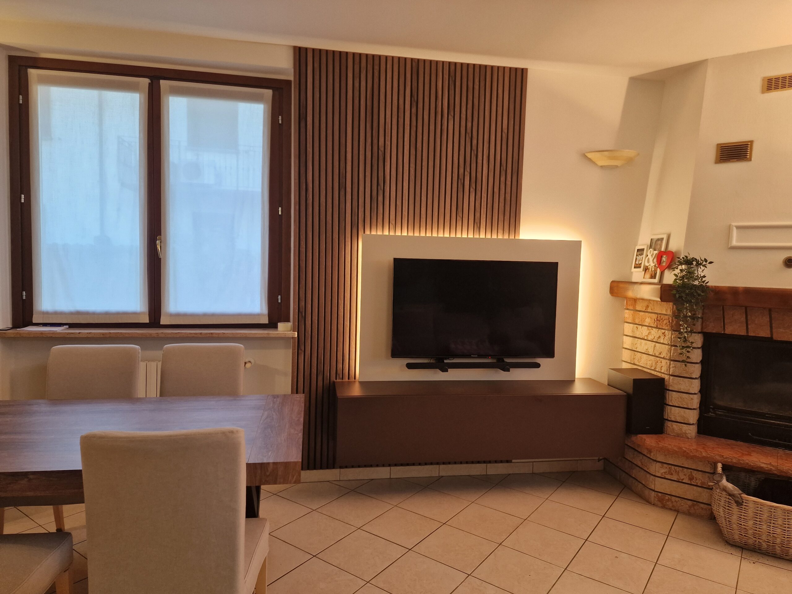 Il Soggiorno: Texture, Luce e Convivialità Spostandoci nell’area living, l’attenzione viene subito catturata dalla parete TV, progettata per integrarsi con grazia accanto al preesistente camino in mattoni. Il Mobile TV San Giacomo, declinato in una sofisticata finitura Caffè opaco, poggia visivamente sui magnifici pannelli cannettati in legno posizionati a parete. Questa boiserie a listelli, impreziosita da una calda retroilluminazione a LED, dona una vibrante tridimensionalità e un tocco di assoluta tendenza all’intero ambiente. A fare da fulcro alla zona conviviale spicca il Tavolo Post di Zamagna. Con il suo design solido e il piano materico, rappresenta l’elemento di congiunzione ideale tra la purezza delle linee del mobile living e l’anima più tradizionale del focolare.
