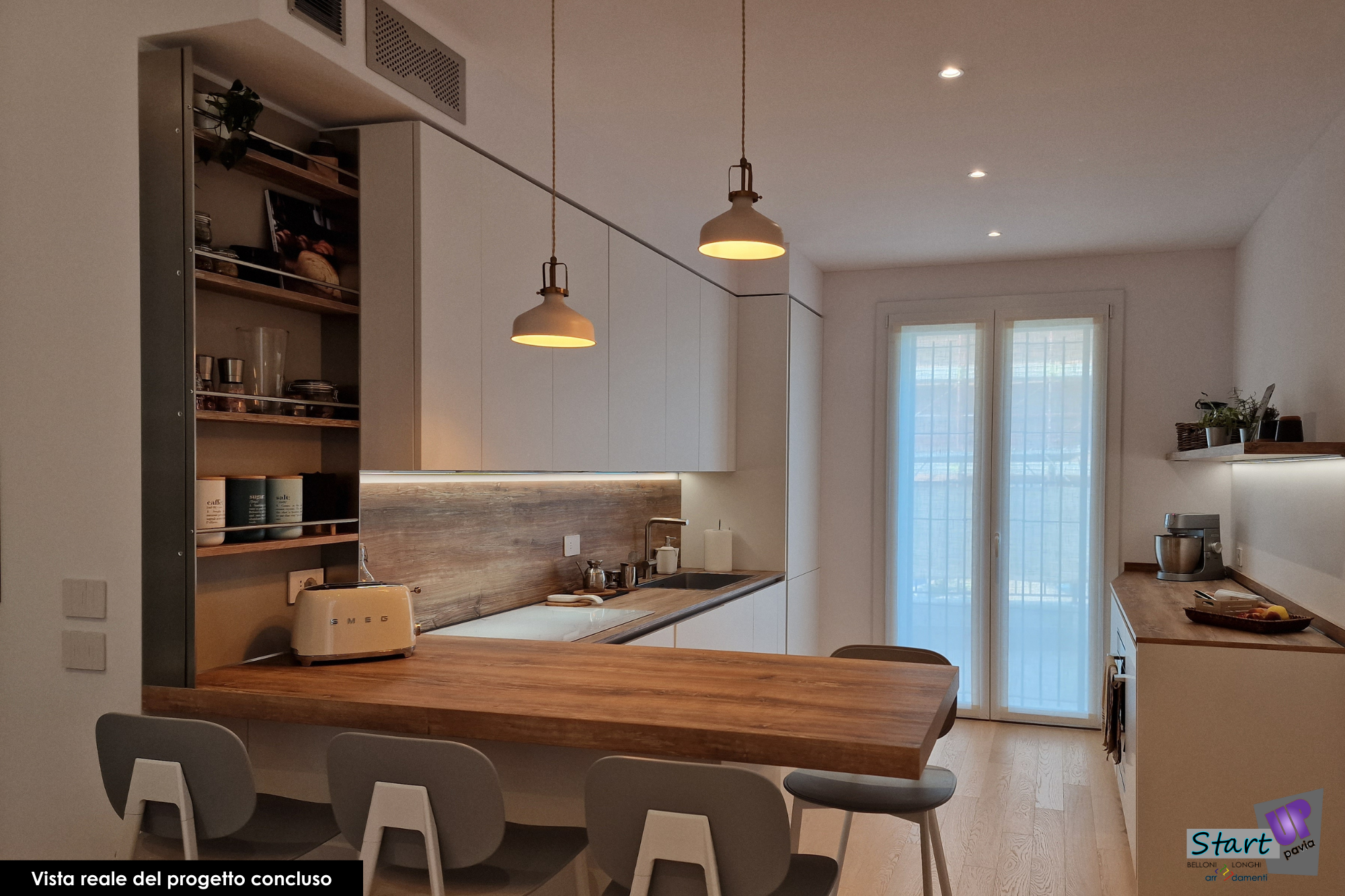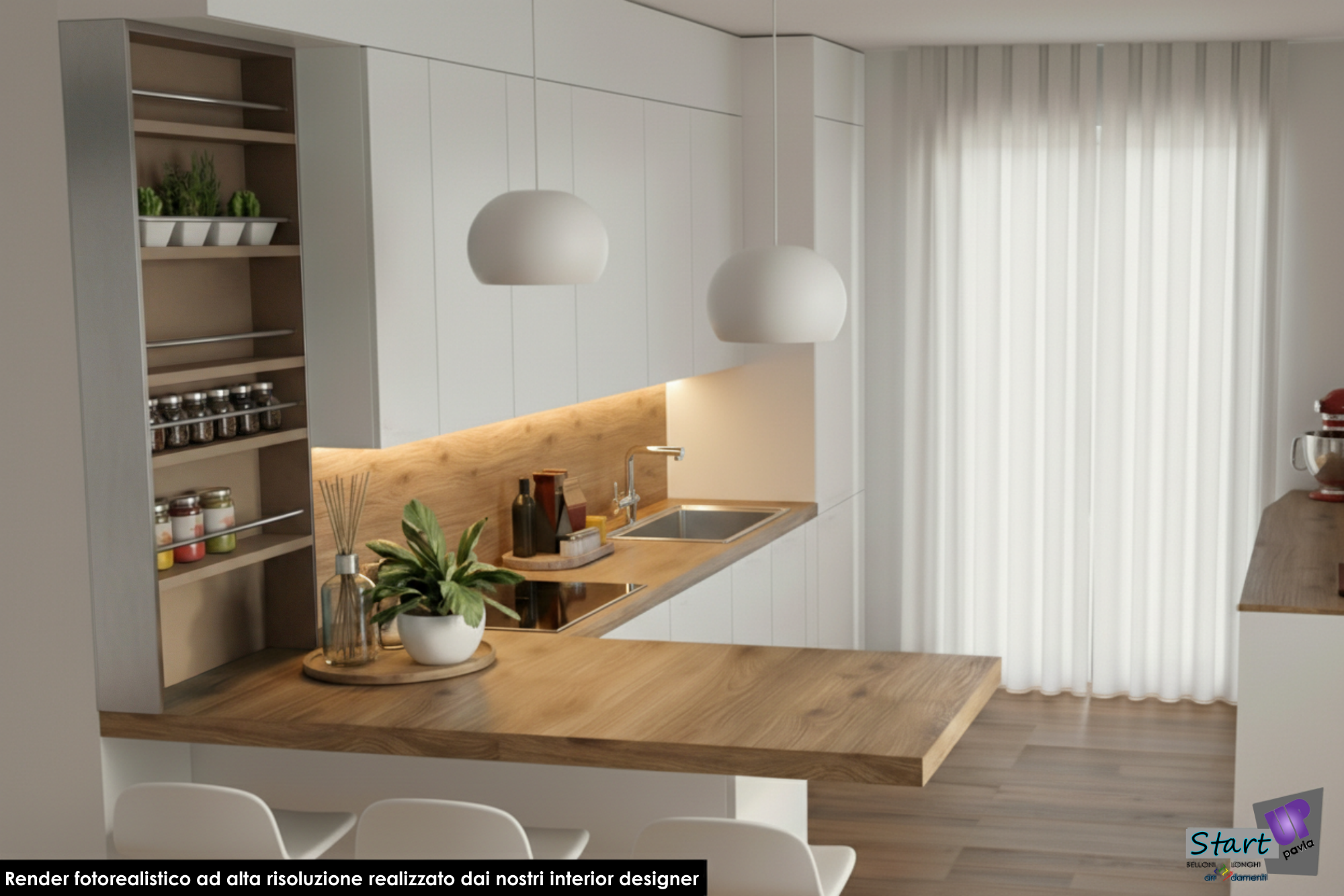 Questa realizzazione racconta la storia di uno spazio che prende vita con estrema naturalezza, dimostrando come un’attenta progettazione possa fondere cucina e soggiorno in un unico ambiente armonioso e profondamente accogliente. Il passaggio dai nostri render iniziali alle fotografie scattate dopo il montaggio rivela la vera forza di questo progetto: l’eleganza pensata su schermo non solo è rimasta intatta, ma si è trasformata in una casa vissuta, concreta e autenticamente su misura per chi la abita.