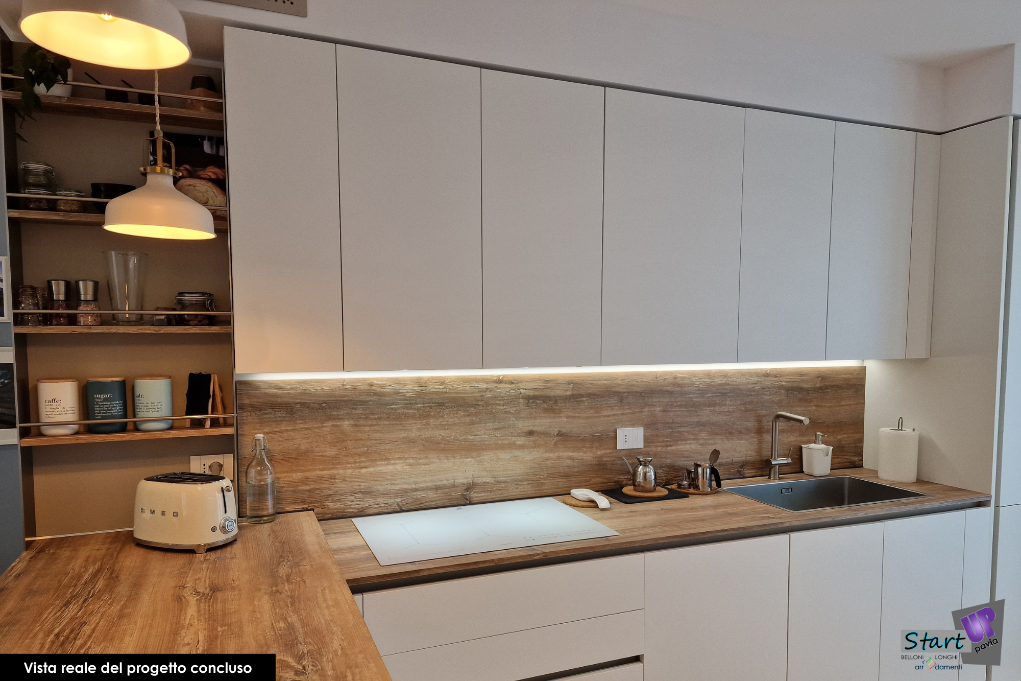 Il cuore operativo della casa è affidato alla cucina Trend Step. Per questa composizione abbiamo scelto di lavorare su una palette cromatica raffinata ed equilibrata. Le basi e i pensili nei luminosi toni Talco Seta donano un’immediata sensazione di ampiezza e pulizia visiva. A fare da contrappunto, l’inserimento del piano di lavoro e delle mensole in legno Forest introduce una forte componente materica: il legno scalda l’ambiente, creando un bilanciamento perfetto tra una sensazione di leggerezza visiva e una rassicurante percezione di solidità strutturale.