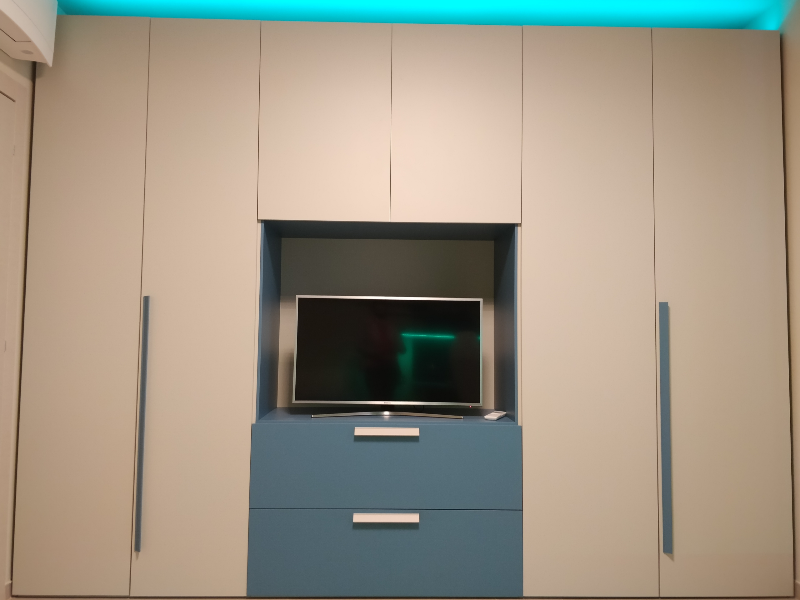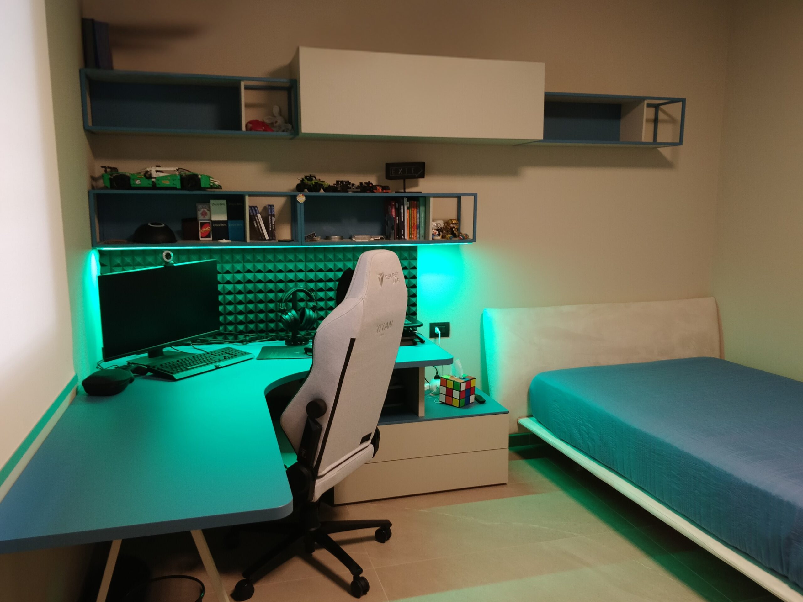 Passando alla zona notte, la camera padronale accoglie un imponente letto LeComfort King Size, la cui testata imbottita con lavorazione capitonné richiama un lusso classico rivisitato, enfatizzato dalla luce puntuale di lampade a sospensione che scendono scenograficamente sui comodini. L’ambiente è completato da una poltrona di design che definisce un angolo dedicato alla lettura e al relax privato. Per i più giovani, la cameretta è stata trasformata in una gaming station custom firmata Battistella, dove l’illuminazione LED blu e il comfort del letto Samoa creano l’ambiente ideale per il gioco, lo studio e il riposo tecnologico.