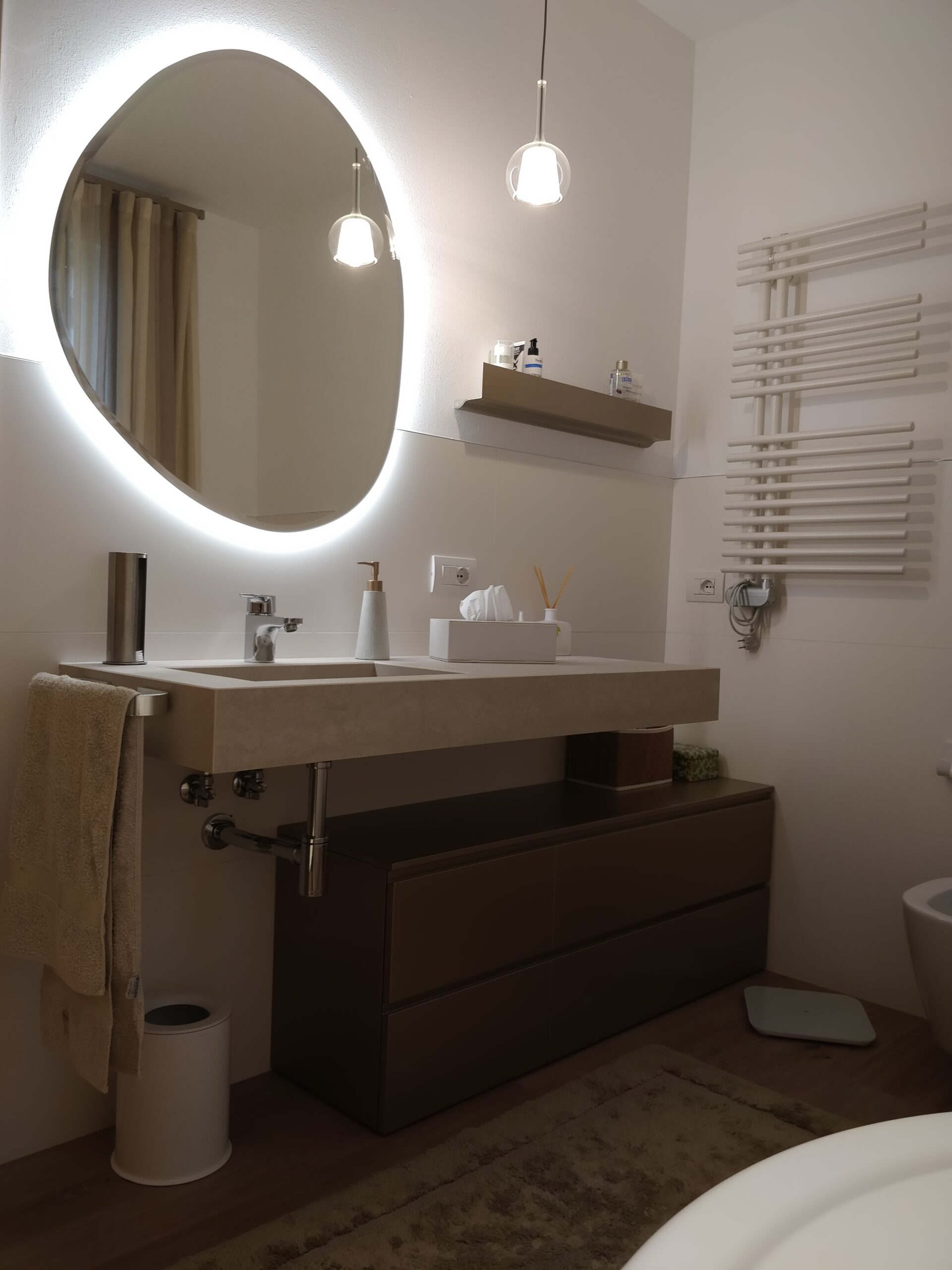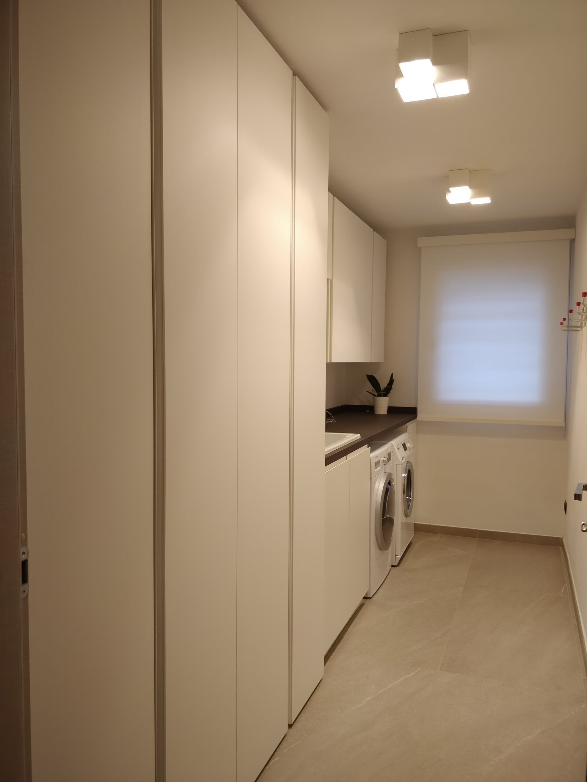 L’attenzione dedicata alla funzionalità domestica è evidente anche negli spazi di servizio, come la zona lavanderia interamente progettata su misura per garantire ordine e massima efficienza senza rinunciare allo stile. Infine, l’esperienza di benessere trova la sua massima espressione nel bagno in suite: una vera spa privata dotata di vasca idromassaggio e una spaziosa doccia walk-in, arricchita da un mobile in gres con lavabo integrato. Questo progetto rappresenta una sintesi d’eccellenza in cui ogni dettaglio, dalla scelta dei brand internazionali alla maestria delle lavorazioni artigianali, concorre a creare una residenza dal fascino intramontabile e dalla vivibilità senza compromessi.