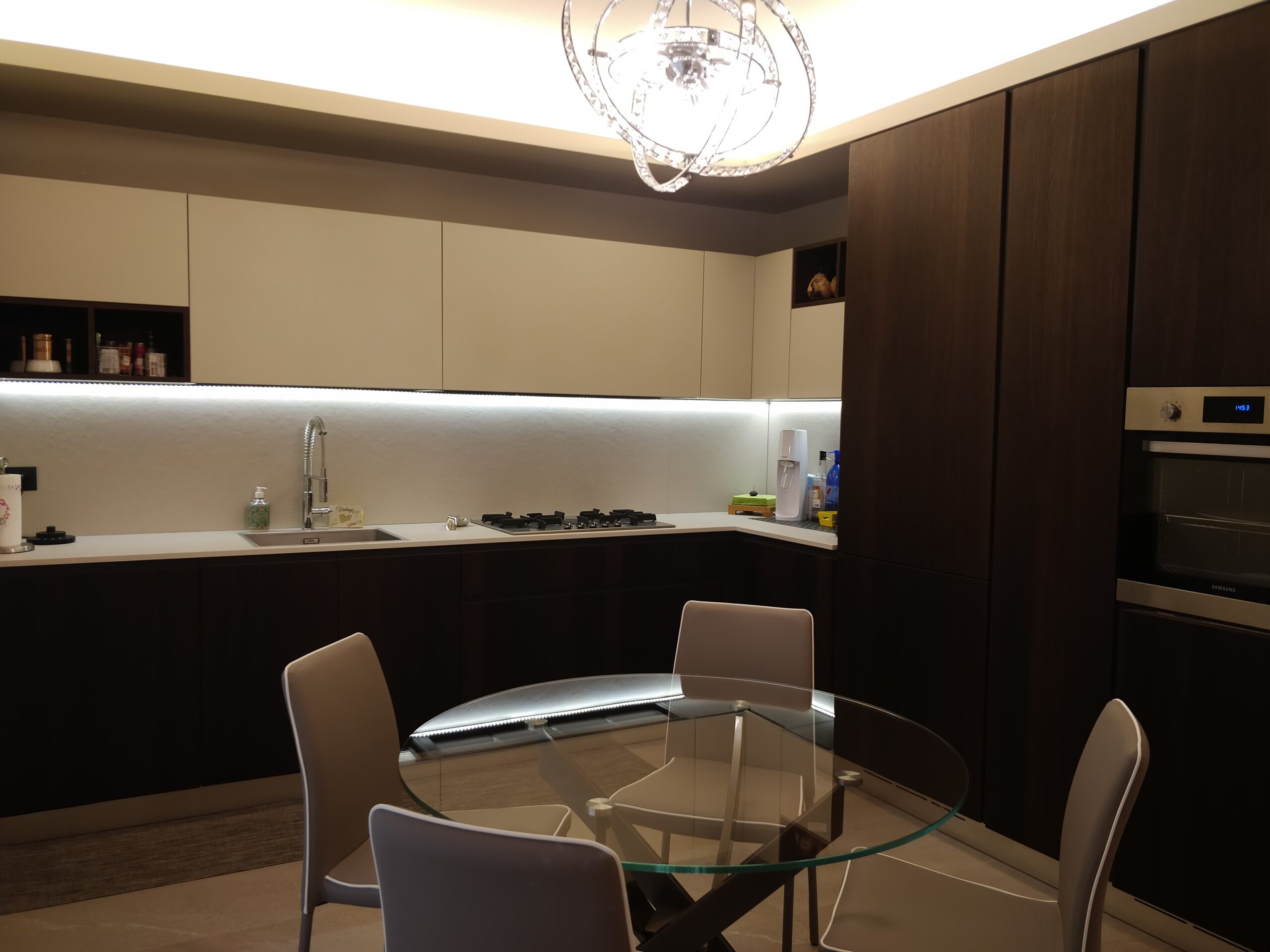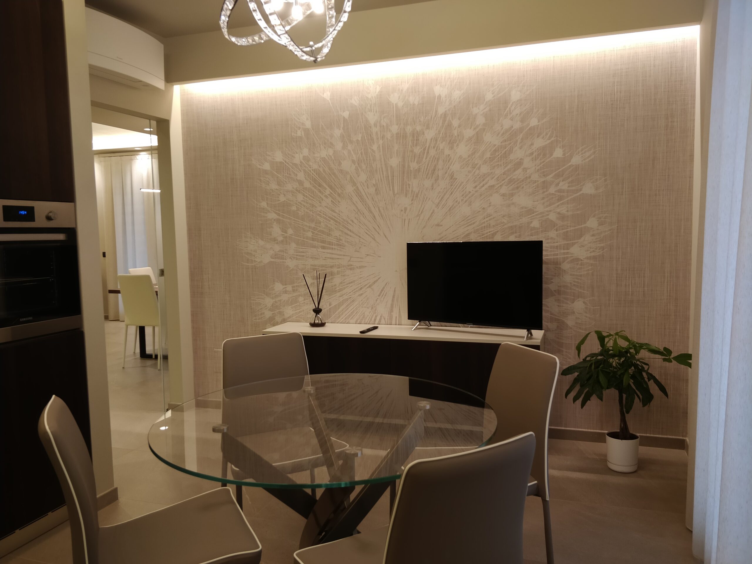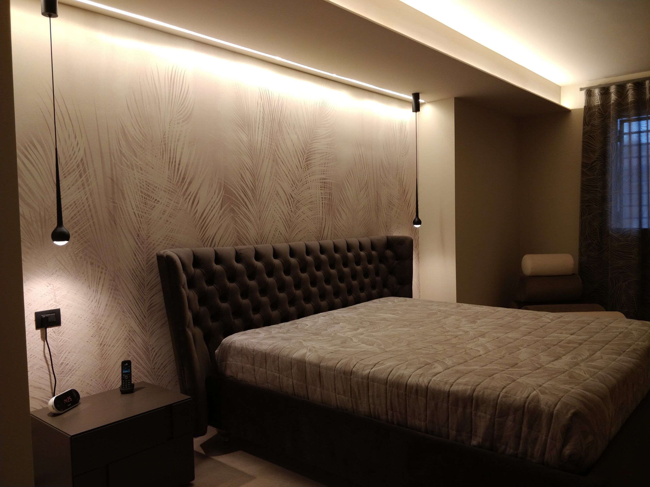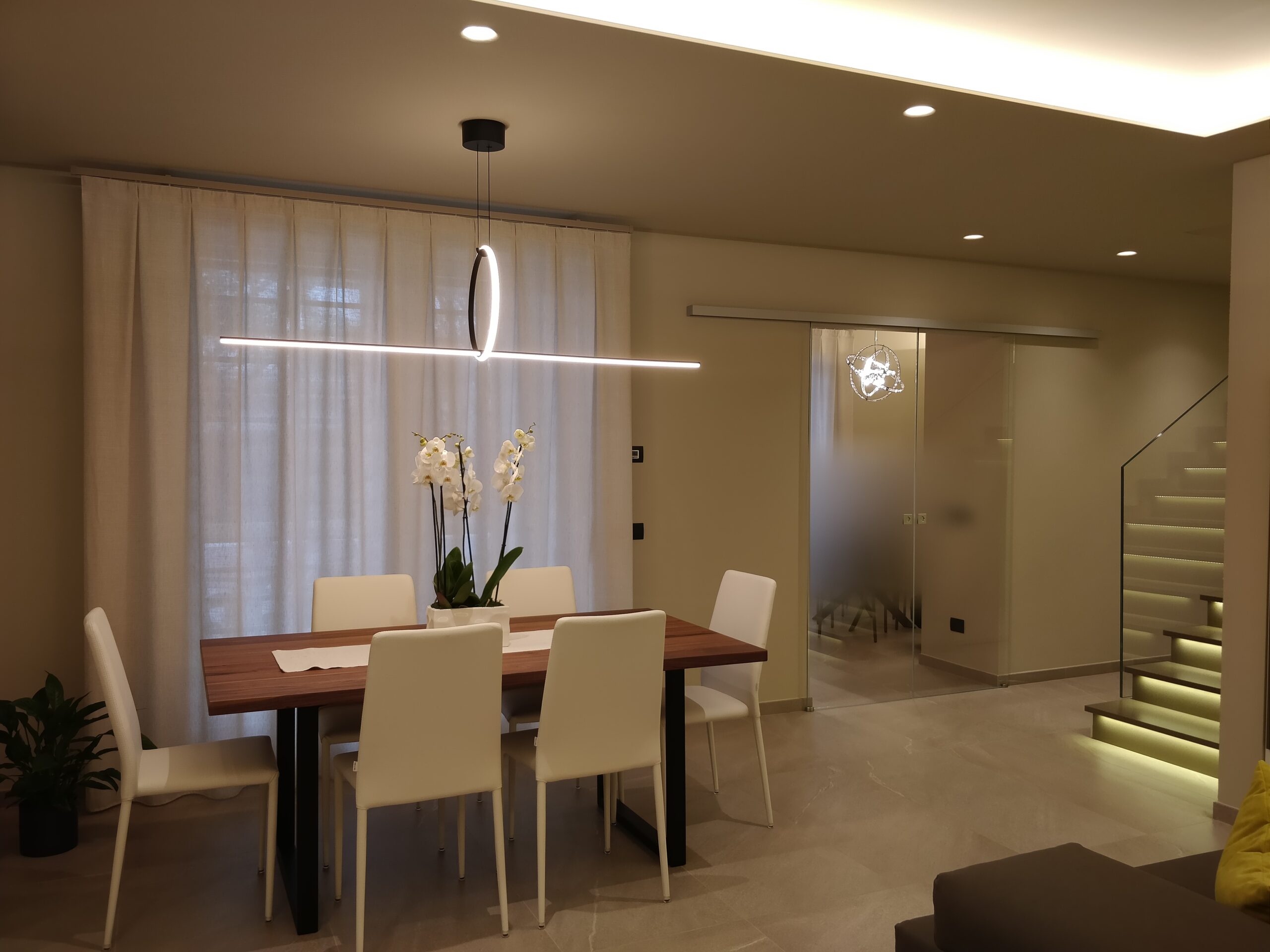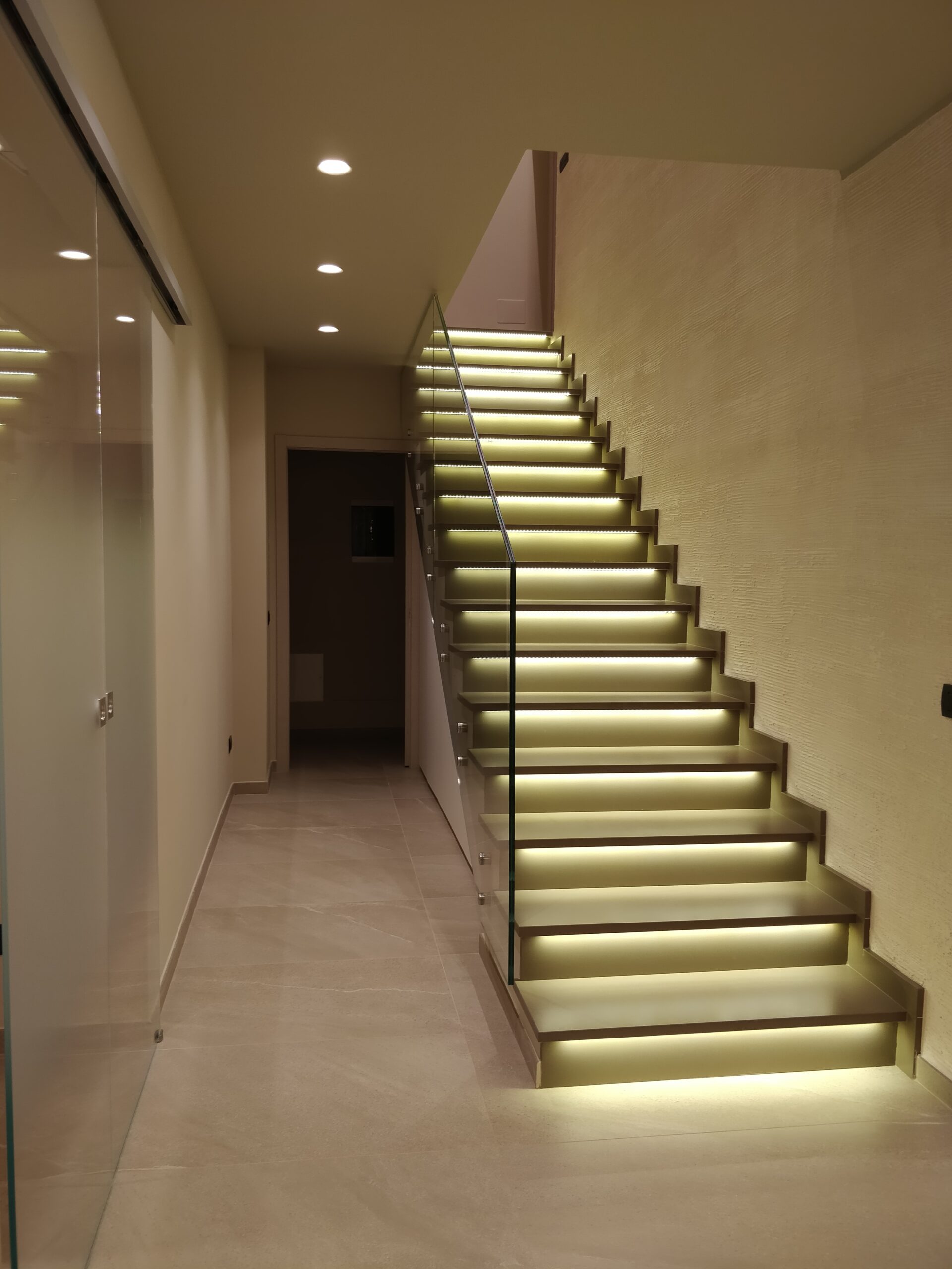 Il percorso all’interno della villa è scandito da un’illuminazione scenografica studiata meticolosamente dai nostri designer, capace di trasformare la percezione degli spazi attraverso tagli di luce radente e atmosfere soffuse. La scala in quarzo, elemento di collegamento verticale, diventa essa stessa un oggetto d’arte grazie all’integrazione di profili LED ad ogni singolo gradino, che ne sottolineano il profilo scultoreo e la preziosità del materiale. Le pareti non sono semplici quinte, ma superfici narrative grazie alle carte da parati su misura di Inkiostro Bianco, che conferiscono profondità e un carattere artistico agli ambienti più importanti della casa.